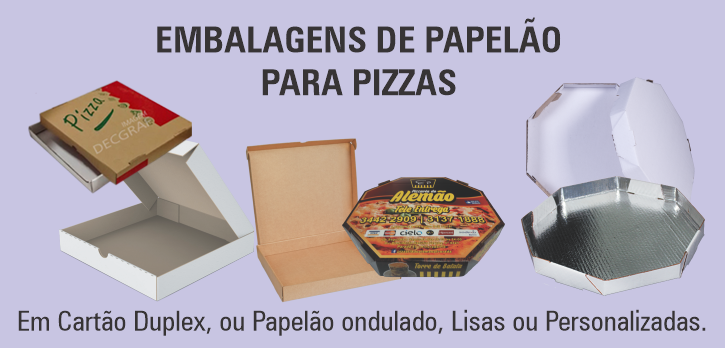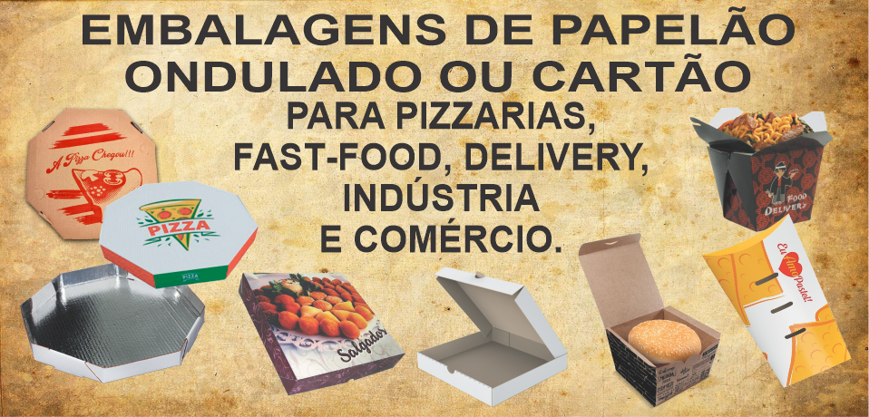 Produzimos e distribuimos embalagens gráficas, em cartão ou papelão corrugado pardo, branco. Com ou sem laminação, lisas ou impressas. Para alimentos e com padrões de higiene, conservação de calorias (pizzas, doces, salgados, xis, cachorro quente, hamburguers, fritas, etc...